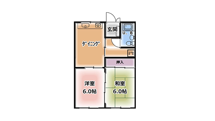 | 間取り | 2DK(DK6、和6、洋6、バス・トイレユニット) |