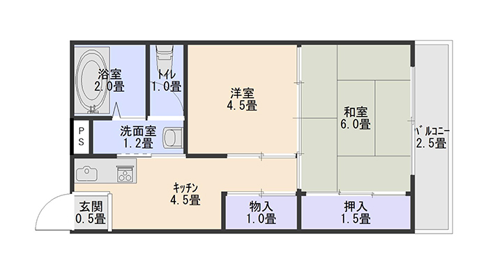 | 間取り | 2DK(DK4.5、和6、洋4.5、バス・トイレ別) |