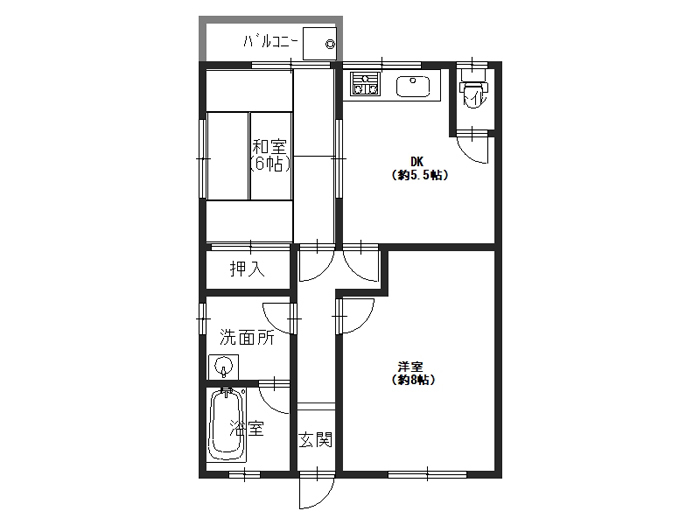 | 間取り | 2DK(DK5.5、和6、洋8、洗面所、バス・トイレ別) |