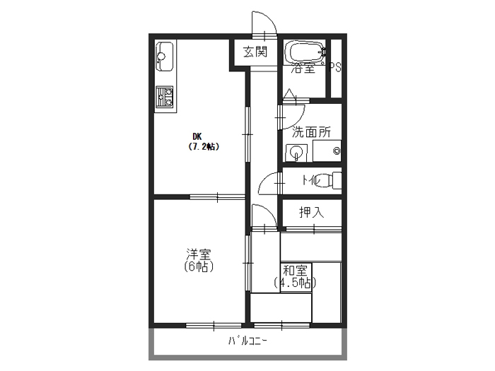 | 間取り | 2DK(DK7.2、洋6、洋4.5、洗面脱衣室、バス・トイレ別) |