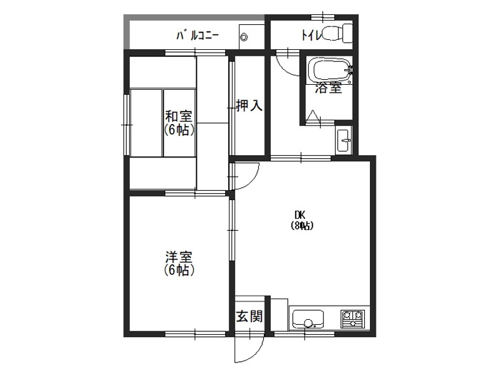 | 間取り | 2DK(DK8、洋6、和6、洗面所、バス・トイレ別) |