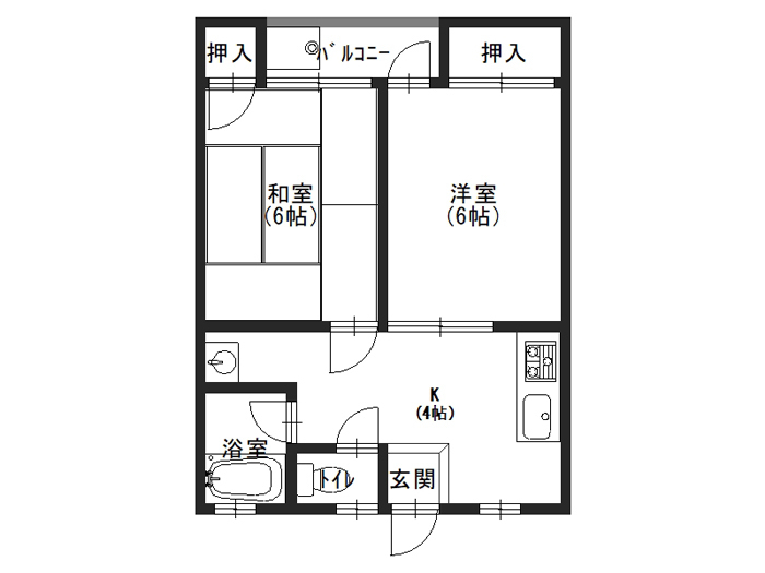 | 間取り | 2K(K4、和6、洋6、洗面所、バス・トイレ別) |